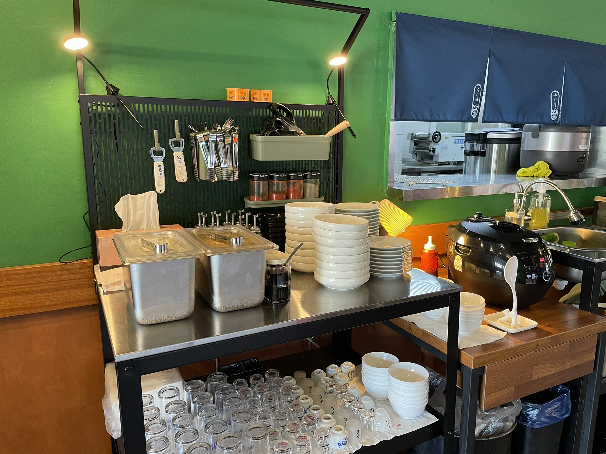 셀프 코너에는 단무지, 양파, 춘장, 밥 등이 있어요